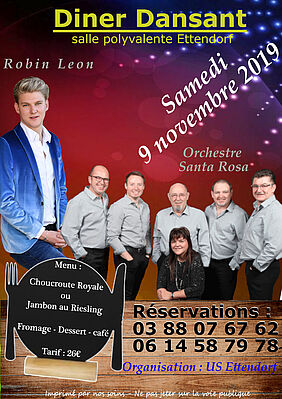 Comme tous les ans, l'US Ettendorf organise un diner dansant le samedi 9 novembre 2019 à partir de 19h30 au Centre Socioculturel d'Ettendorf (salle polyvalente).