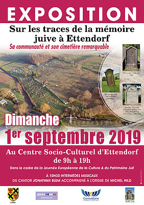 Le dimanche 1er septembre 2019, l'Association pour la Préservation du Cimetière Israélite d'Ettendorf (APCIE) présentera une exposition sur l'histoire du cimetière et de la communauté juive d'Ettendorf au Centre Socioculturel d'Ettendorf rénové.